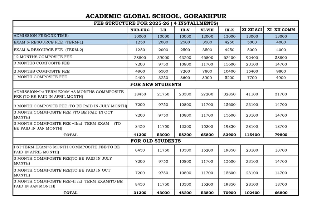 Fee Structure - Academic Global School, Gorakhpur